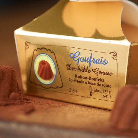 Der kühle Genuss in Gugelhupfform, umhüllt mit 100%-igem Kakao-Puder, ist alkoholfrei, nussfrei und glutenfrei. Hergestellt wird Goufrais in Weil am Rhein am Rande des südlichen Schwarzwaldes. Die hochwertigen Zutaten schmelzen zart im Mund und sorgen so für ein unvergessliches und lang anhaltendes Geschmackserlebnis.